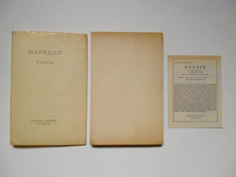 J. Manrique, Poesie Scelta, introduzione e traduzione di Mario Pinna Vallecchi Editore, 1962. Cm 21x13,5; pp. 166. Cartoncino edit. marrone muto con sovraccoperta edit. marrone; sovraccoperta di acetato edit. trasparente muta. Condizioni di conservazione Esemplare in ottimo stato di conservazione. Ex libris incollato alla prima bianca. Schedino edit. e targhetta con prezzo. Testo spagnolo a fronte. SETT79.L21530G