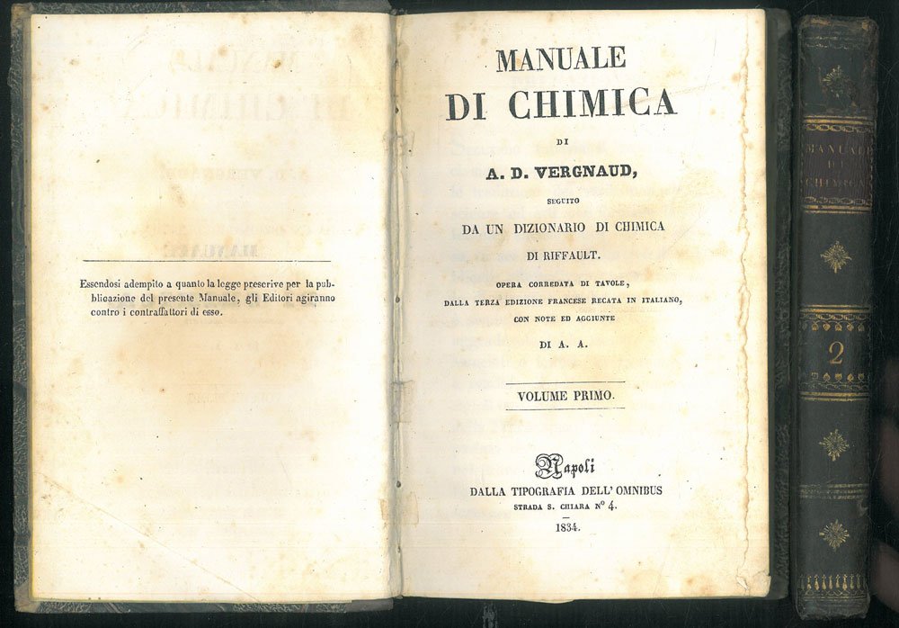 Manuale di chimica di A. D. Vergnaud, seguito da un dizionario di chimica di Riffault. Opera corredate di tavole, dalla terza edizione francese recata in italiano, con note ed aggiunte di A. A.