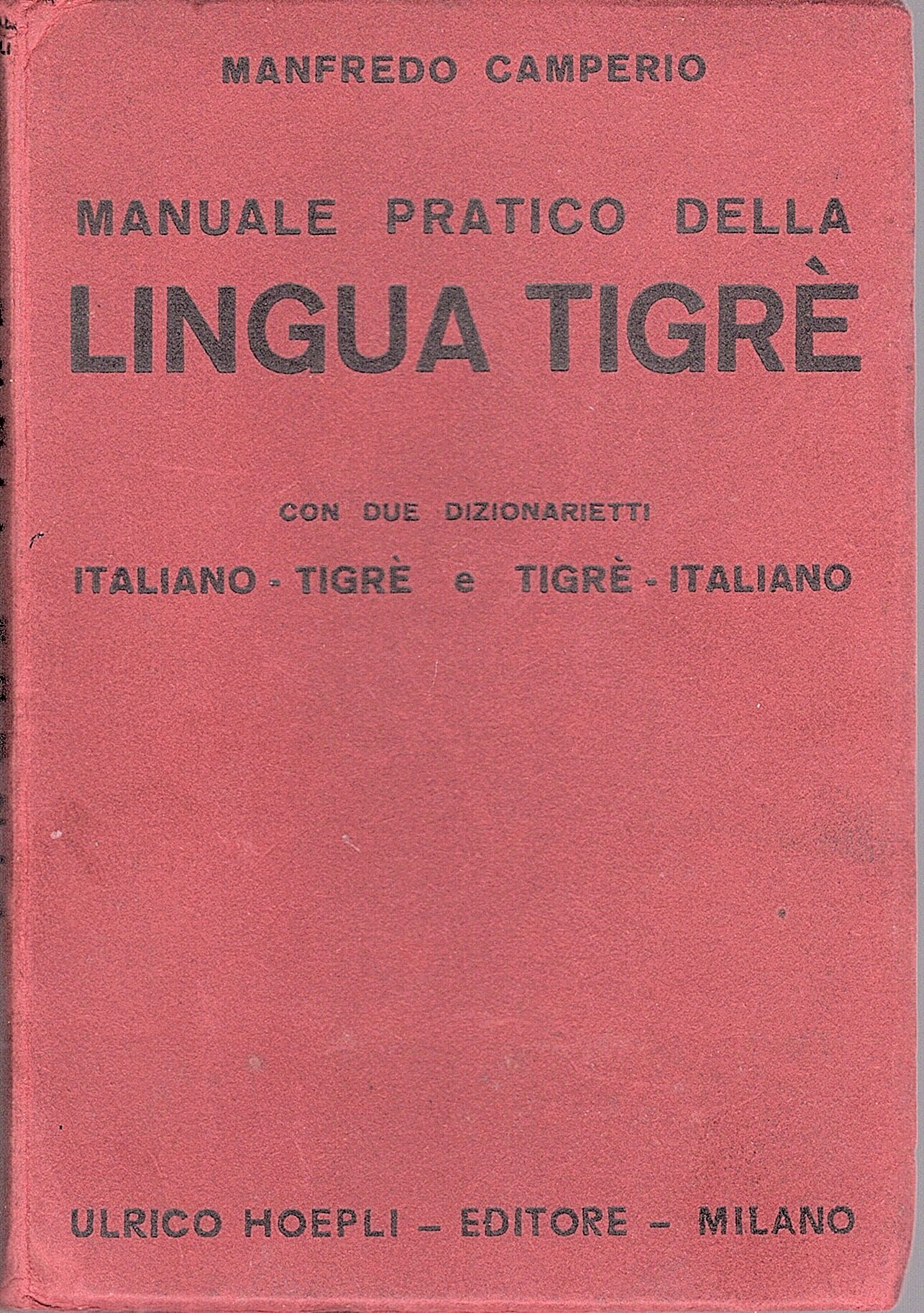 In-16° (16x11 cm), cartoncino editoriale mattone con titoli in nero al dorso e al piatto anteriore, sguardie decorate. Pp 159, (5), 1 tavola a colori fuori testo. Firma di appartenenza di un generale al foglio di guardia anteriore. Conservato il foglietto volante di pubblicità editoriale dei manuali concernenti le lingue parlate in Africa. Minimi segni del tempo ma più che buon esemplare fresco e genuino. Ristampa dell'edizione del 1894 di questo prontuario linguistico della lingua tigrina, idioma tramandato solo oralmente e dunque di difficile trascrizione in allfabeto latino. L'autore fu militare e geografo: partecipò attivamente alla colonizzazione africana e fondò la rivista L'esploratore.