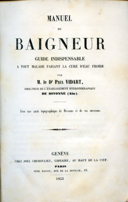 In-16°, pp. 86, brossura posteriore marmorizzata rosa All'antiporta, ripiegata, una carta topografica di Divonne e dei suoi dintorni. Un timbro primonovecentesco di privato possesso. Buon esemplare. Edizione originale ed unica, rara. L'autore era direttore dello Stabilimento idroterapico di Divonne, nell'Ain. Contiene anche cenni, oltre che sulle cure idroterapiche in senso proprio, sul regime alimentare (latte freddo, burro, pane), sui bagni di vapore, sulle escursioni da fare nei dintorni di Divonne, sugli esercizi di ginnastica da praticare da parte di chi si sottopone alle cure delle acque.