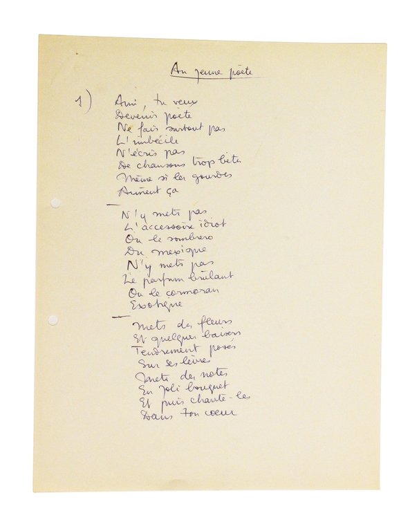 Manuscrit autographe complet de la chanson de Boris Vian intitulée Au jeune poète ou Conseils à un ami