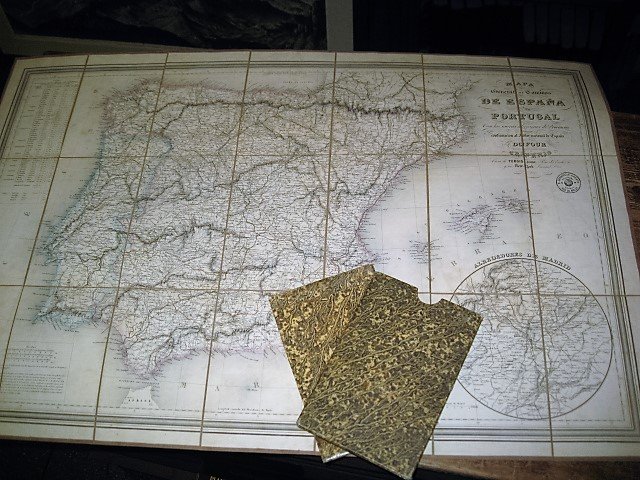 Incisione originale in acciaio in-folio, in scala 1:2.000.000 (ma con l'indicazione di scala espressa anche in altre unità), misurante, dispiegata, 625x945mm. La mappa, montata su tela, disegnata da Auguste Henri Dufour, riveduta e migliorata da Alexandre Vuillemin ed incisa dal Gobert, è tratta dall'Atlas Nacional de España (pubblicato in complessivi 13 fogli su tela) e presenta i confini territoriali colorati in lastra, i margini graduati e, al proprio interno, un'altra cartografia circolare dei dintorni di Madrid ('Alrededores de Madrid'; questa veduta è in scala 1:633.000 ca.). Un timbro del tempo del geografo ed editore parigino Andriveau-Goujon. Ottimo esemplare conservato entro camicia originale in brossura marmorizzata ed entro ulteriore astuccio in cartoncino marmorizzato. Auguste Henri Dufour (Parigi, 1795-ivi, 1865), discepolo del Lapie, fu fra i più stimati geografi e cartografi francesi dell'800, autore fra l'altro di svariati e rigorosi atlanti; il Vuillemin fu il suo allievo principale. TMM, I, 396 e IV, 338.