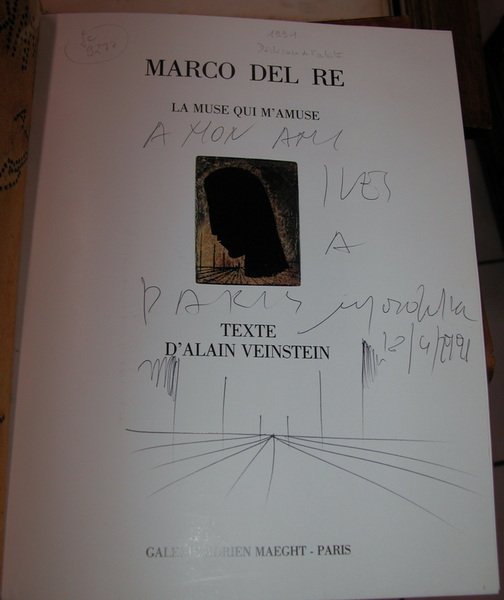 35p. dont 24 planches couleurs. Très bon état. Catalogue édité à l'occasion de l'exposition "La Muse qui m'amuse" présentée en 1991 à la Galerie Adrien Maeght (Paris). Reproductions couleurs précédées d'un texte d'Alain VEINSTEIN, "Notes en marge d'une répétition", illustré de vignettes. Exemplaire avec dédicace manuscrite de Marco DEL RE accompagnée d'un petit croquis, et avec une petite carte illustrée annonçant le vernissage. Broché sous couverture à rabats illustrée; gardes illustrées.