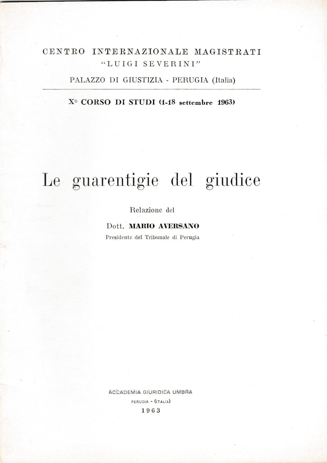 CENTRO INTERNAZIONALE MAGISTRATI LUIGI SEVERINI PALAZZO DI GIUSTIZIA PERUGIA X∞ CORSO DI STUDI (1-18 SETTEMBRE 1963) LE GUARENTIGIE DEL GIUDICE RELAZIONE DEL DOTT. MARIO AVERSANO PRESIDENTE TRIBUNALE PERUGIA ACCADEMIA GIURIDICA UMBRA 1963 L 4579 COPERTINA EDITORIALE MORBIDA INTERNO IN BUONO STATO PAG. 13 CM. 24 X 17
