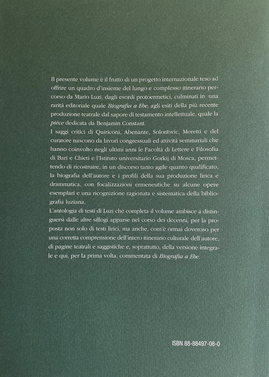 Il presente volume è il frutto di un progetto internazionale teso ad offrire un quadro d'insieme del lungo e complesso itinerario percorso da Mario Luzi, dagli esordi protoermetici, culminati in una rarità editoriale quale Biografia a Ebe, agli esiti della più recente produzione teatrale dal sapore di testamento intellettuale, quale la pièce dedicata da Benjamin Constant. I saggi critici di Quiriconi, Abenante, Solonovic, Moretti e del curatore nascono da lavori congressuali ed attività seminariali che hanno coinvolto negli ultimi anni le Facoltà di Lettere e Filosofia di Bari e Chieti e l'Istituto universitario Gorkij di Mosca, permettendo di ricostruire, in un discorso tanto agile quanto qualificato, la biografia dell'autore e i profili della sua produzione lirica e drammatica, con focalizzazioni ermeneutiche su alcune opere esemplari e una ricognizione ragionata e sistematica della bibliografia luziana. L'antologia di testi di Luzi che completa il volume ambisce a distinguersi dalle altre sillogi apparse nel corso dei decenni, per la proposta non solo di testi lirici, ma anche, com'è ormai doveroso per una corretta comprensione dell'intero itinerario culturale dell'autore, di pagine teatrali e saggistiche e, soprattutto, della versione integrale e qui, per la prima volta, commentata di Biografia a Ebe.