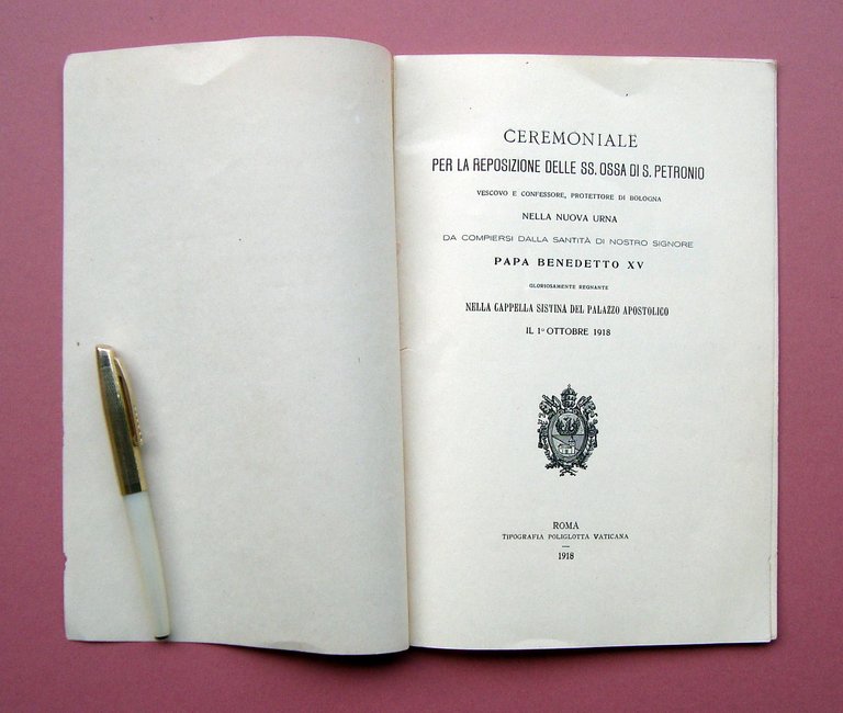 fascicolo, Ceremoniale per la reposizione delle SS.Ossa di S.Petronio nella nuova urna Tip. poliglotta Vaticana, Roma, 1918; cm 25x16,5; pp. 8. Facicoletto rilegato a cordella con br. bianche vedi foto. Condizioni di conservazione Esemplare in buonissime condizioni con minime tracce del tempo. SC03.D17554 blu