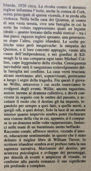 Conseguenza inevitabile sarà il sanguinoso coinvolgimento della famiglia nel conflitto. La casa verrà bruciata; alcuni moriranno; altri, sopravvissuti, porteranno a lungo i segni della tragedia. Fra questi il giovane Willie, attraverso i cui occhi osserviamo lo svolgersi degli eventi. Willie, ancora ragazzino, assiste inerme al dramma collettivo, e dovrà convivere inseguito con le ombre del passato, e accettare il ruolo che il destino gli ha imposto, legandolo per sempre a quei fatti, a quelle morti, a quegli odi, a quei dolori. Solo la luce di un amore intenso quanto impervio sembra poter rischiarare una visione della vita in cui, appunto, si è comparse in un dramma mille volte rappresentato, fantocci nelle mani di un burattinaio molto beffardo. Racconto corale, affresco storico, vicenda d'amore, educazione sentimentale: in questo che è stato definito il miglior libro di William Trevor, lo scrittore irlandese sembra aver profuso tutta la sua sapienza narrativa. Marionette del destino, per acutezza psicologica e sviluppo dei personaggi, per densità di eventi e ampiezza di visuale, sa conferire alla parola romanzo il suo significato più profondo e completo.