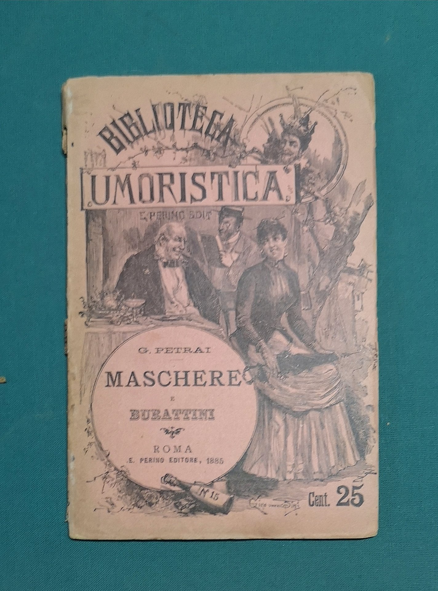 >in-16, pp. 96, broch. edit. fig. Interessante monografia dedicata alle più celebri maschere e burattini: Arlecchino, Frighella, Capitan Spaventa, Cassandro, Florindo e Colombina, Gianduja, Mezzettino, Pantaleone, Pulcinella, Rugantino, Stenterello...Numero 15 della collana ''Biblioteca Umoristica''. Cat. Rasi p. 476.