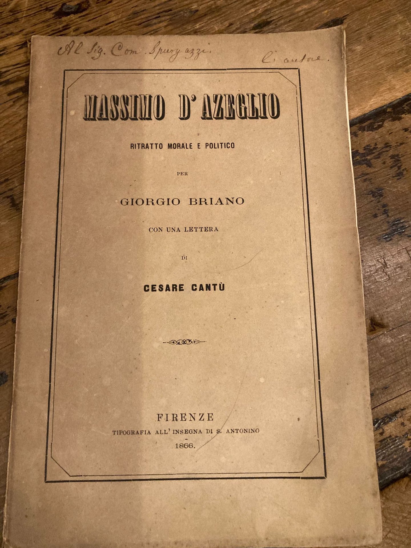 In-8° 22x14 cm), pp. 56, brossura editoriale riquadrata. Più che buon esemplare con invio autografo dell' autore al piatto. Edizione originale di questo ritratto a tutto tondo del d' Azeglio. In appendice una lettera inedita di Cantù all' autore. G. Briano (Carcare, 1812-Roma, 1874), patriota, giornalista, autore teatrale e letterato, fu fra l'altro amico, biografo e corrispondente del Pellico.