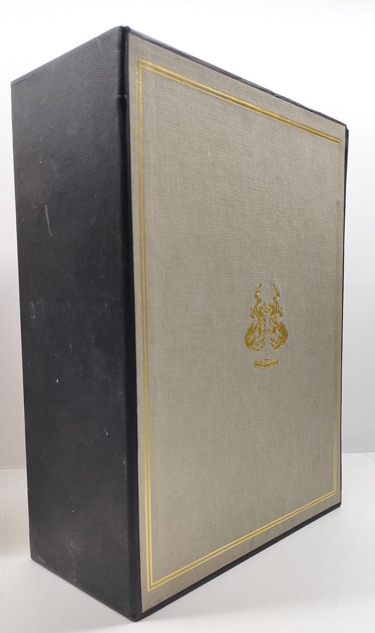 cofanetto rigido editoriale con sporcizie e lievi segni di usura, legatura rigida in pelle rossa con titolo in oro al piatto anteriore e al dorso, al primo volume una rottura tra piatto anteriore e dorso e abrasioni dovute all'incollamento delle copertine all'interno del cofanetto, tagli con fioriture, quarta di copertina del secondo volume con alcune abrasioni dovute all'incollamento con il piatto anteriore del primo volume, lievissima brunitura al margine esterno delle pagine, numero pagine 191 dimensioni cm 29 * 20,8 * 10,5
