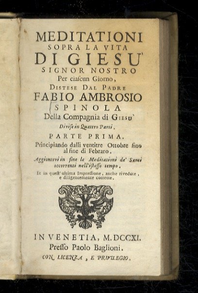 Meditationi sopra la vita di Giesù signor nostro per ciascun giorno, distese dal padre Fabio Ambrosio Spinola della Compagnia di Giesù. Parte prima [- parte terza - parte quarta]. Aggiontovi in fine le meditazioni de' santi occorrenti nell'istesso tempo. Et in quest'ultima impressione, anche rivedute, e diligentemente corrette.