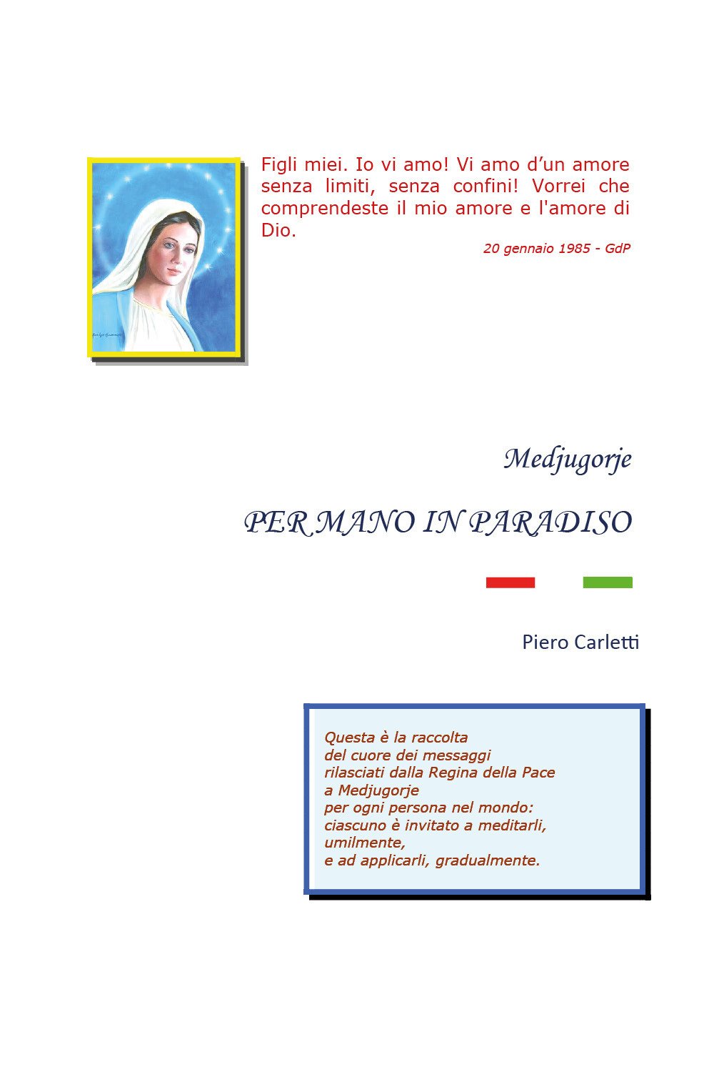 Questa è la raccolta del cuore dei messaggi rilasciati dalla Regina della Pace a Medjugorje, nelle apparizioni iniziate nel 1981. Attraverso di essi l'Immacolata spiega il motivo delle apparizioni, le grazie che Dio concede ed i mezzi attraverso cui i suoi figli possono ottenerle. Spiega poi in maniera semplice la preghiera, la Santa Messa, il sacramento della Confessione, ma anche come superare le difficoltà della vita, i rapporti con gli altri, la famiglia e la Chiesa. Questo manuale pratico contiene le schede di sintesi delle azioni pratiche che la Madonna indica per vivere la giornata insieme a Lei. Il libro contiene infine una raccolta di preghiere e devozioni, tra cui la Divina Misericordia, il Sacro Cuore, il Cuore Immacolato, la Via Crucis, oltre alle indicazioni per le indulgenze ed il Rosario.