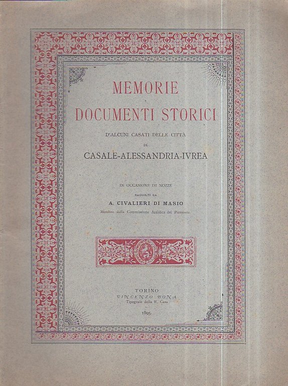 In-8 grande, pp. 19, brossura editoriale con titolo in rosso e nero entro bordura ornamentale egualmente in bicromia. Ottimo stato. Raro opuscolo per le nozze di Teresa Civalieri-Inviziati di Masio e Gioachino San Martino dei conti di San Martino e Strambino.