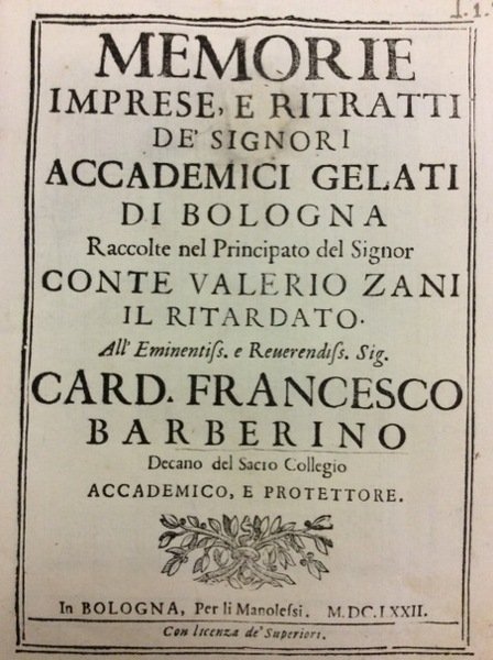 MEMORIE IMPRESE E RITRATTI DE' SIGNORI ACCADEMICI GELATI DI BOLOGNA. - Raccolte nel Principato del Signor Conte Valerio Zani, il Ritardato.