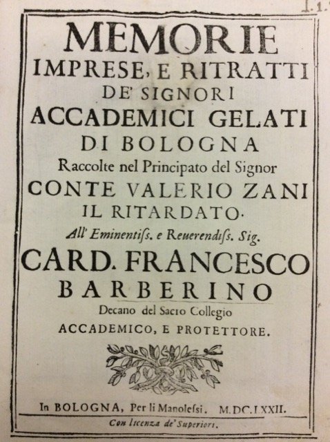 In-8 p. (mm. 213x155), p. pergam. coeva (picc. manc. al dorso), 11 cc.nn., 413 pp. (mal numer. 406), 1 c.nn. (con una citazione di Tacito e le Approvazioni) + 2 cc.nn. (poste tra le pp. 52 e 53) che contengono la biografia di Alfonso Della Valle (Marchese di Mirabello); ornato da numer. fregi e grandi iniziali decorate inc. su legno; frontespizio e testo inquadrati in duplice filetto. "Manca" la c. 12 preliminare con la grande impresa dell'Accademia dei Gelati.<br>Rara "edizione originale" molto ben illustrata da: una antiporta (raffig. un porticato barocco nel cui sfondo si scorge una campagna con alberi spogli e la veduta di Bologna); un ritratto del Cardinale Barberino (cui è dedicata l'opera) inc. in rame da Hubert van Otteren, 31 grandi ritratti in ovale e 70 (su 71) imprese finemente inc. in rame, nel testo Opera di notevole importanza per la cultura bolognese e l'emblemistica secentesca.<br>Cfr. Piantanida,III/IV,3621: Interessante bio-bibliografia con elenco delle opere stampate e manoscritte degli Accademici considerati - Melzi,II, p. 183: Stando a quanto scrive l'Orlandi queste Memorie sono per la maggior parte fattura del suddetto conte Valerio Zani - Cicognara,1830 - Lozzi,I, p. 179 - Frati Bibliogr. bolognese, p. 791, n. 6479 - Praz Studies in the XVII Century Imagery, p. 245: 31 portraits and 71 copperplates of devices engraved by Laur. Tintus after I.M. Mitellus and othersSolo 2 cc. con strappetti, frontesp. restaur. per picc. manc., altrimenti esemplare su carta forte, ben conservato.