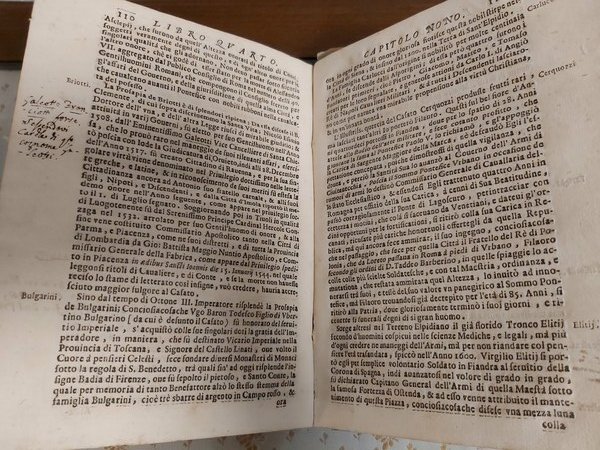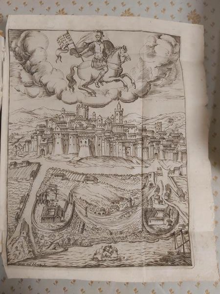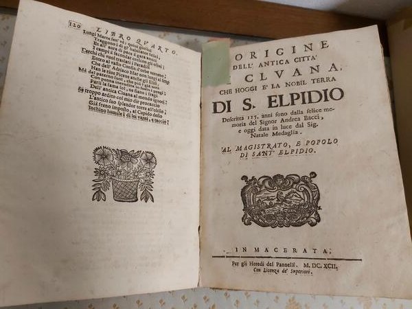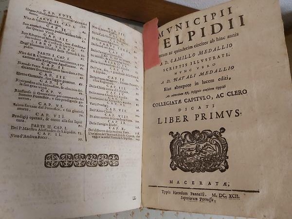 2 opere in un vol. in-4, pp. (8), 180; (4), leg. ottocentesca m. tela con carta dec. ai piatti e tit. mss al d. Con una bella tav. in rame ripiegata al front. raffigurante la veduta prospettca di S. Elpidio. Rara ediz. orig. della storia di S. Elpidio, in provincia di Ascoli Piceno, sorta sull'antica città romana di Cluana. Ranghiasci p. 253. Lozzi cita una seconda ediz. del 1716: "Raro". [MM2-175]