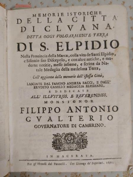 MEMORIE ISTORICHE della città di Cluana detta oggi volgarmente di S. Elpidio nella provincia della Marca, colla vita dei Santi Elpidio, e Sisinnio suo discepolo, e con altre antiche, e moderne notitie, messe insieme, e scritte da Natale Medaglia della medesima terra. Coll'aggiunta delle Memorie dell'istessa città, lasciate dal famoso Andrea Bacci, e dall'erudito Camillo Medaglia Elpidiani.