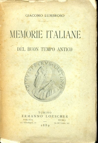 In-8°, pp. (8), 266, brossura editoriale verdina con riproduzione di una medaglia effigiante Pietro Aretino.Alcune illustrazioni in b.n. n.t. Ottima copia in barbe. Prima edizione. Raccolta di studi storici sull'Italia dei secoli passati: la Giustizia e l'Ingiustizia dipinte da Giotto, la guida compilata dal Petrarca ad uso di un pellegrino, testi, letture e ricolette nelle Università medievali, un carme universitario conservatoci dall'Ariosto, una palinodia del '400 in lode della vita coniugale, le donne, le oche e le capre, 'come altra volta in Italia si potesse essere ad un tempo servi e padroni d'Amore', 'dal mangiar colle dita al mangiar colla forchetta', 'di quel che fece Agostino Chigi il Magnifico in una cena data a Leone X e come c'entri il Vespro Siciliano'£, i viaggi e l'ospitalità di una volta, le raccolte in morte, una sentenza di Giovanni delle Bande Nere, i maestri di zecca di Pietro Aretino, Pietro Strozzi ellenista, Filippo Pigafetta vicentino e l'aspetto dell'Italia nel Seicento, lettere di un romagnolo del secolo scorso (Pietro Godenti da Rimini) su Parigi e su Voltaire, Carlo Tenivelli e l'anno 1797 in Piemonte, costumi dei contadini di Romagna, costumi di Nizza, costumi di Sardegna, spigolature nello studio comparativo delle tradizioni popolari d'Italia.