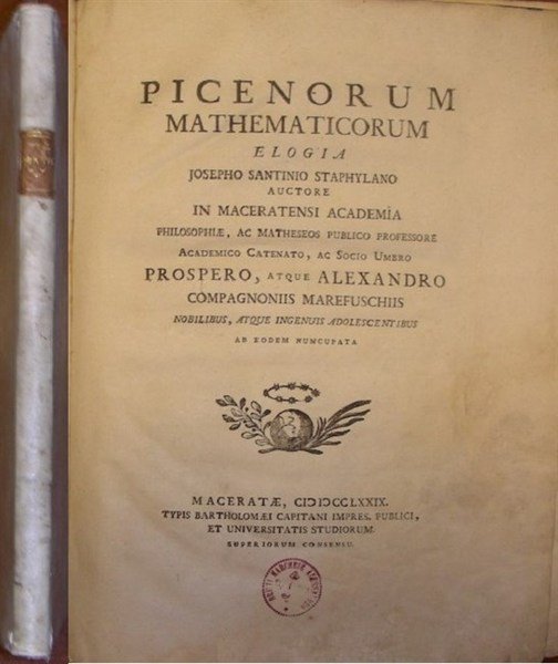 in-8 gr., pp. 368, rileg. primo Novecento in cart. dec. con tass. in pelle e tit. oro al d. Bell'esempl. di non comune storia locale marchigiana. [048]