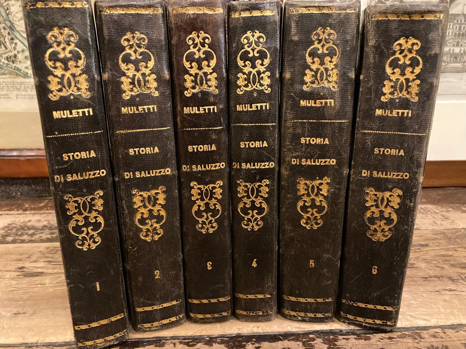 6 volumi in-8° (21x13 cm), bella legatura in mezza pelle con titoli, tomaison e fregi dorati ai dorsi, piatti marmorizzati, tagli spruzzati. Pp XIX, 441, (9); VI, (2), bianche, 511, (5); 396, (4), [XV, (1), 29, (7)]; 385, (1); VIII, 441, (5), [(2), 56. 1 tavola ripiegata]; XVIII, (2), 486, (2). Complessive 24 tavole f.t. incise litografia (numerose le tavv. ripiegate), disegnate da F. Muletti: 4 vedute di Saluzzo, 2 vedute dei castelli di Manta e di Verzuolo, una grande pianta topografica di Saluzzo, una tav. dell'assedio del 1487, 15 tavv. raffiguranti ritratti, monete, monumenti e opere d'arte di Saluzzo e dei Marchesi; 4 grandi tavole genealogiche ripiegate. Ex-libris applicati ai contropiatti anteriori. Nel complesso più che buon esemplare. Edizione originale, assai rara, della classica storia di Saluzzo del Muletti (1755-1808), pubblicata a cura del figlio Carlo, la cui narrazione corre dalla fondazione della città al 1548, quando Saluzzo fu inglobata nel dominio francese. L'opera costituisce la più completa e approfondita opera sulla storia politica e religiosa del Marchesato di Saluzzo. All'edizione sono aggiunte altre 2 opere: 'Calamitas calamitatum, Commentariolum' di Giovanni Giacomo de Fia (studioso saluzzese contemporaneo del Petrarca), a cura di Carlo Muletti (1830) in calce al terzo volume; 'L'assedio di Saluzzo dell'anno 1487, descritto da Bernardino Orsello' (1831) in calce al quinto volume. <br>Cfr. Platneriana, p. 338 (ed. del 1839). Lozzi, II, 4674 (in nota). Manno, 10770. Hugon / Gonnet, 968.