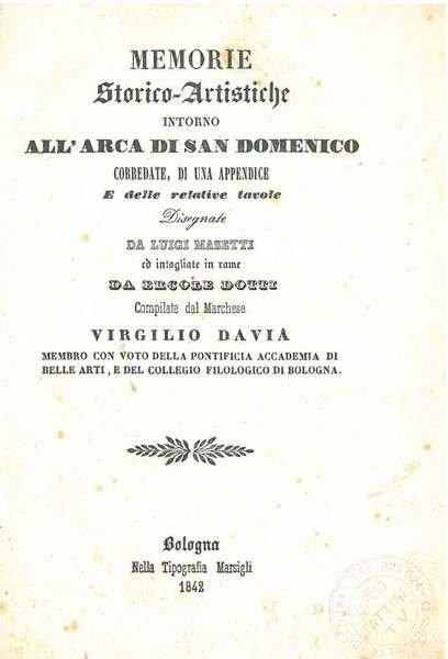 Memorie storico-artistiche intorno all'Arca di San Domenico corredate di una appendice e delle relative tavole disegnate da Luigi Masetti ed intagliate in rame da Ercole Dotti