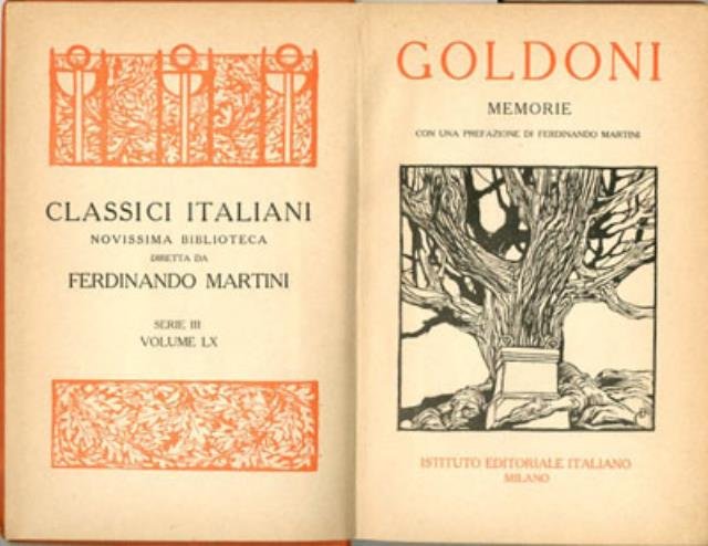 2 v. (336, [1] c. di tav.; 318 p.) : ill. ; 19 x 12 cm. Classici italiani. Scritte in francese quando ormai il loro autore si avvicinava agli ottant’anni, le "Memorie" di Goldoni ripercorrono la vicenda lunga e cruciale di un protagonista della nostra storia letteraria. In uno stile semplice, quasi da conversazione, si alternano gli aneddoti vivaci della vita teatrale e le grandi lotte di idee, i momenti privati e le messinscene delle commedie, gli incontri con i grandi della letteratura e della politica e i piccoli incidenti della quotidianità. I volumi sono corredati da una prefazione di Ferdinando Martini. Legatura editoriale, coperta in cartonato rigido con tela di colore arancio, titolo impresso in oro al piatto e al dorso. Qualche segno del tempo, pagine leggermente imbrunite ma nel complesso volumi leggibili. Codice libreria 1447.