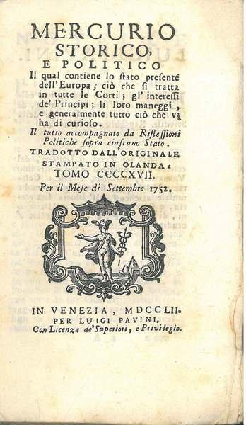 Mercurio storico e politico il quale contiene lo stato presente dell'Europa; ciò che si tratta in tutte le corti; gl'interessi de' Principi; li loro manegi, e generalmente tutto ciò che vi ha di curioso. Il tutto accompagnato da riflessioni politiche sop