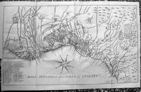 gr. vol. in folio, pp. XXIV, 597, 4, leg. carta dec. coeva e tass. in carta al d. Front. a due colori con vignetta in rame. Con una gr. tav. ripiegata in rame (mm.350x600) raff. il territorio veneto compreso tra Ferrara, Padova, Treviso, Sacile, Udine, Aquileia e il golfo di Venezia, con 41 rimandi. L'opera è divisa in tre parti: il Collegio e il Magistrato alle Acque, la preservazione della laguna, dei lidi e dei fiumi, e nell'ultima parte l'Esazione. L'opera riveste particolare importanza per la comprensione dell'organizzazione del lavoro in materia di acque e anche per il lessico usato dalle genti venete. Cicogna 192-193. Picc. mancanze al d. ma esempl. a larghi margini, completo della grande tavola spesso mancante. Intonso. [286]