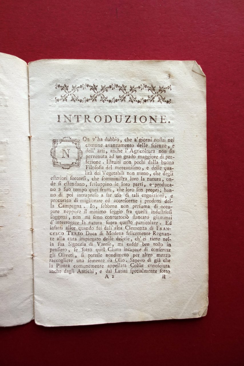 Gaetano Pratesi, Metodo per seminare, e coltivare il seme di colsat e per estrarne l'olio usato in Fiandra, Toscana, e Romagna [.] da Gaetano Pratesi Fiorentino direttore de' Giardini di S. A. Serenissima il Sig. Duca di Modena ec. ne' suoi Stati Presso la Soc. Tipografica, Modena 1777; cm 17,5x12; pp. 16 con qualche piccolo fregio inc. in b/n. Mancanza della legatura ma esemplare compatto grazie alle cuciture. Al frontespizio timbretto - ex libris d'epoca del precedente proprietario (raccolta privata). Condizioni di conservazione Esemplare in buone condizioni con tracce d'uso, mancante di legatura ma compatto grazie alle cuciture; alcune leggerissime bruniture e qualche minimo alone; margini leggermente rifilati. Piccole pieghette agli angoli di alcune pagine. OPEB.5317 N