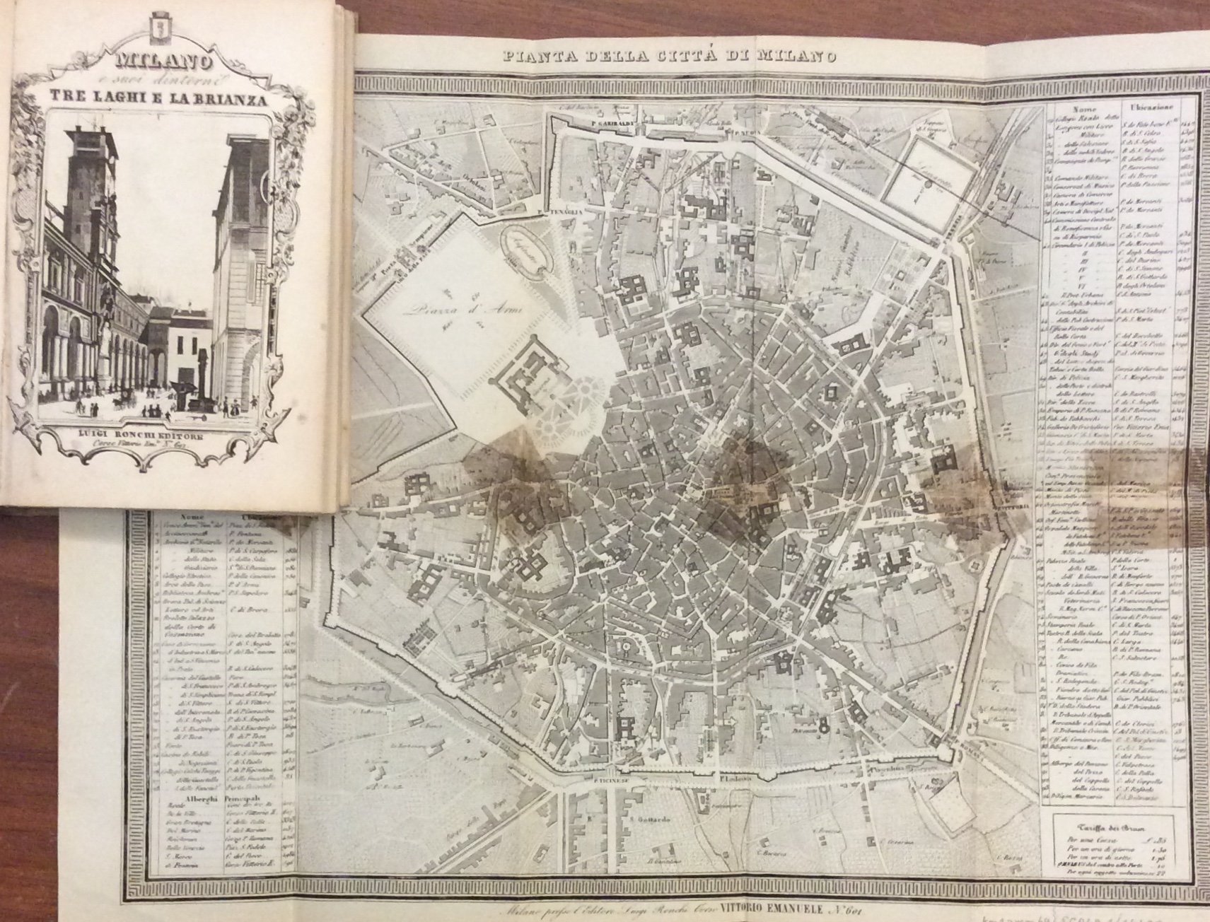 In-16 (mm. 175x110), cartonato moderno, titolo manoscritto su etichetta al dorso, pp. (2),220, con alcune incisioni nel testo (anche a piena pagina) che raffigurano monumenti, 3 tavole fuori testo, una pianta della città di Milano, una cartina dei dintorni di Milano e una carta postale del Regno Lombardo Veneto. Contiene, con proprio frontespizio, da p. 116 a 218: "Viaggio ai laghi Maggiore, di Lugano, di Como, d'Orta, al Varesotto, Magenta e Brianza" per cura di Massimo Fabi. Cfr. L. Villa, Bibliografia delle Guide di Milano, scheda n. 257. Alc. postille con inchiostro rosso, altrimenti esemplare ben conservato.