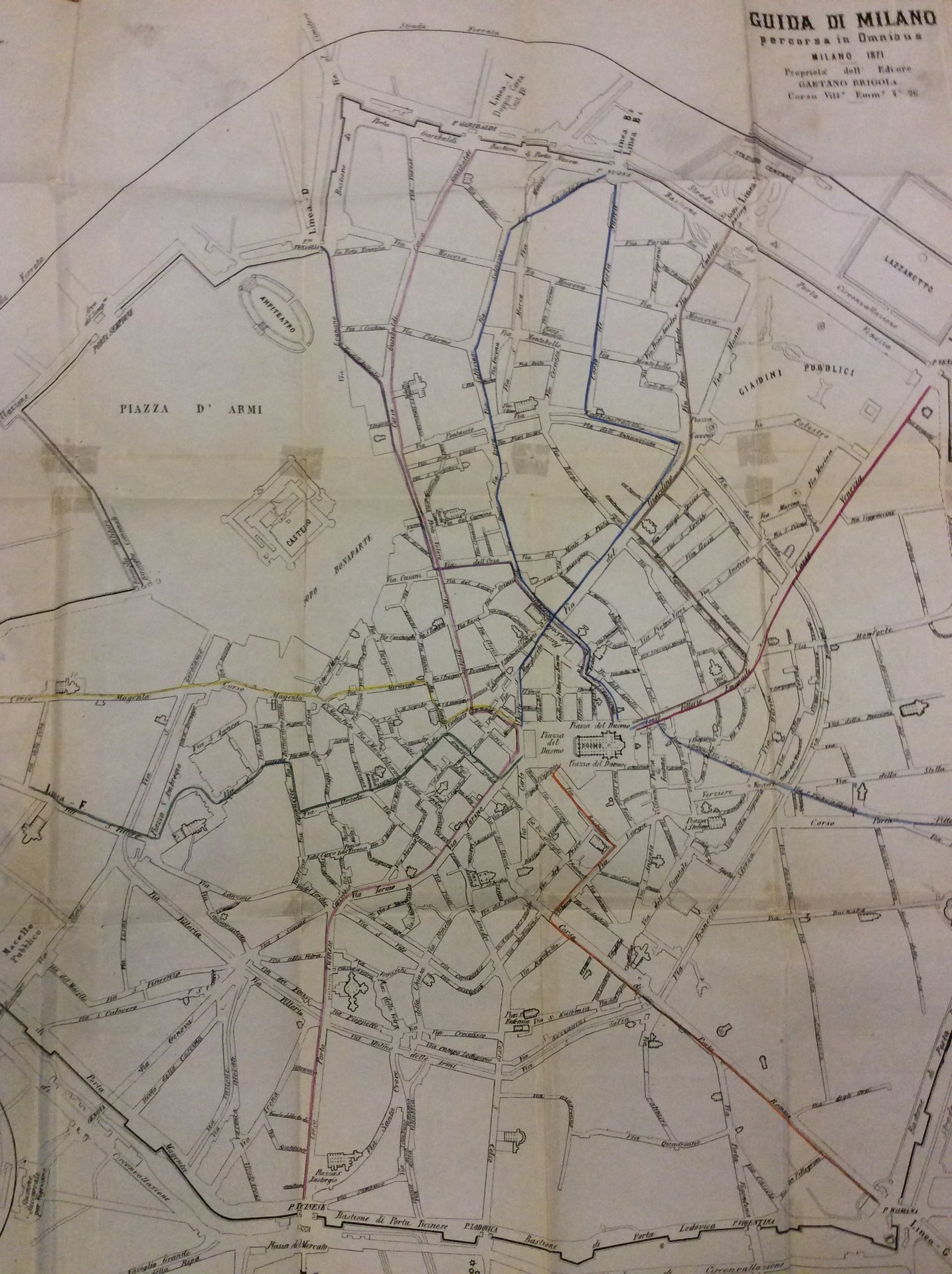 MILANO PERCORSA IN OMNIBUS. - Guida per chi vuole visitare con poco dispendio di tempo e di denaro, tutto quanto di piu' rimarchevole offre questa citta'. Compilata da Gaetano Brigola ed illustrata da notizie storiche ed artistiche da Felice Venosta.
