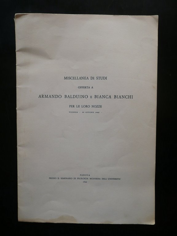 AA. VV., Miscellanea di Studi offerta a Armando Balduino e Bianca Bianchi per le loro nozze Vicenza - 30 Giugno 1962 Presso il Seminario di Filologia Moderna dell'Università, Padova 1962, cm 31x21, pp. 104; brossura ed. Condizioni di conservazione Esemplare in buone condizioni con tracce d'uso e una leggera ammaccatura alla parte sup.; brossure con minime pieghette agli angoli; margine inf. della br. ant. con un paio di circoscritte lievi gore che interessano in misura minima anche qualcuna delle prime pagine; dorso con alcuni piccoli strappetti, di cui uno di qualche cm alla cuffia sup.; qualche pagina con leggere rimovibili sottolineature, segnetti e/o qualche breve annotazione a matita. Non comune edizione omaggio per nozze che contiene vari interessanti saggi di critica letteraria e filologia moderna. Tra gli autori vi sono Vittore Branca, Pier Vincenzo Mengaldo, Giorgio Pullini, ecc. (per un elenco completo vedi foto indice). Edizione in tiratura limitata di L esemplari con numerazione romana e di 150 esemplari con numerazione araba; n/s XLVI. SETT92.L8509 N