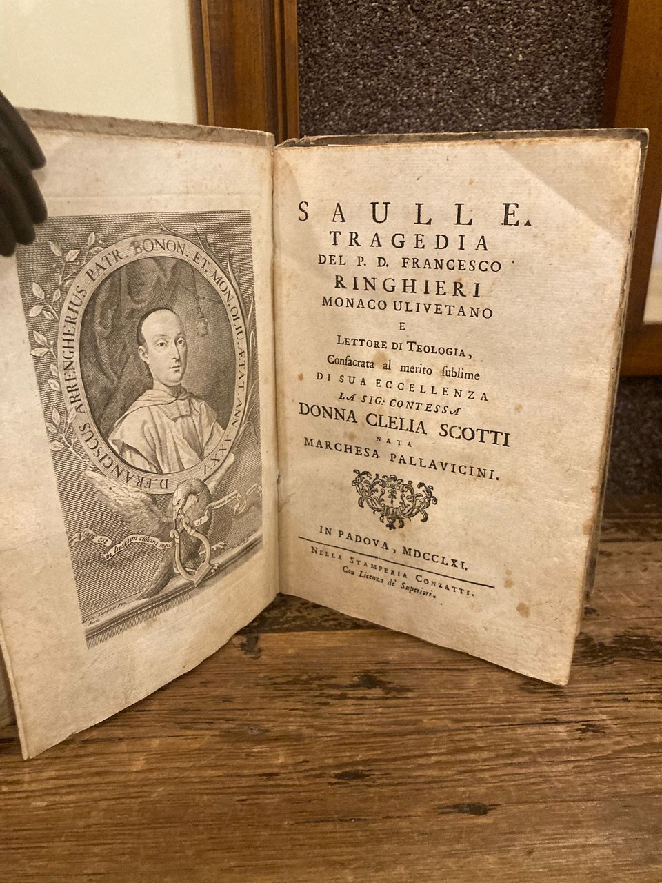 Miscellanea di 4 opere teatrali del Ringhieri (Imola, 1721-ivi, 1787) in un vol. in-8° (188x131mm) in cartonatura rustica coeva con titolo manoscritto in antico alla cuffia superiore. Fregi xilografici ai frontespizi dei vari volumi. Fioriture sparse, qualche lieve alone marginale. Buon esemplare. Comprende: 1) Saulle. Tragedia. Consacrata al merito sublime di Sua Eccellenza la Sig. Contessa Donna Clelia Scotti nata Marchesa Pallavicini. Padova, Conzatti, 1761, pp. (14), 62, (1). Ritratto dell'autore inciso su rame entro cornice ovale, con aquila che sorregge col becco una lira, all'antiporta del volume. Prima edizione. 2) L'Osiride. Tragedia. Ibidem, 1760, pp. 103. Prima edizione. 3) Sara in Egitto. Tragedia. Ibidem, 1757, pp. 126, (4). Prima edizione. 4) Brunechilde. Tragedia. Seconda edizione riveduta, e migliorata dall'Autore. Ibidem, 1766, pp. 124, (4). Il Ringhieri (il suo nome secolare era Pompeo Ulisse, poi mutato in Francesco allorché prese i voti), monaco ulivetano e lettore di teologia, è noto soprattutto per la sua produzione tragica, che incontrò notevole popolarità nell'Italia del Settecento e che le compagnie teatrali amarono spesso rappresentare con grande abbondanza di spettacolari effetti scenici. Definito sprezzantemente il tragico del volgo e degli Ebrei dal Napoli-Signorelli (sia per il facile successo popolare che per le numerose trame attinte allAntico Testamento), è stato però anche epitetato come il più eretico dogni altro frate tragediante in quel secolo per la sua estrema libertà nei confronti delle regole di unità aristoteliche. Cfr. Fantuzzi, Scrittori Bolognesi, VII, 190; De Tipaldo, V, 446; Gianni Cicali, Più eretico dogni altro frate tragediante in quel secolo. Francesco Ringhieri, monaco e drammaturgo, tra testi, polemiche, attori e documenti in Quaderni d'italianistica, XXXI, n. 1, 2010.