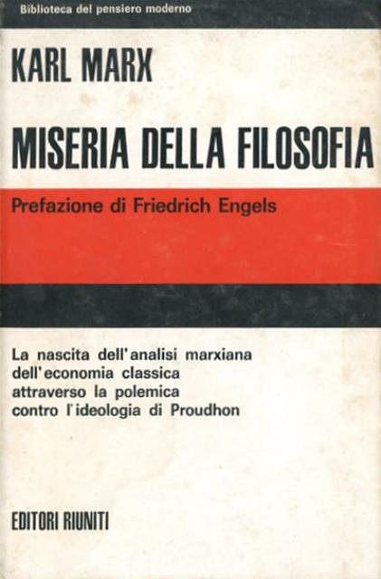 3. ed., 1 rist. 194 p. ; 22 x 15 cm. Biblioteca del pensiero moderno. L'opera è stata scritta da Marx in francese tra il dicembre 1846 e il 15 giugno 1847 e pubblicata nel luglio 1847. Il saggio rappresenta nell'opera complessiva di Marx la nascita dell'analisi dell'economia classica attraverso la polemica contro l'ideologia libertaria di Proudhon. Prefazione di Friedrich Engels. Titolo originario dell'opera: «Misère de la philosophie. Réponse à la philosophie de la misère di M. Proudhon» (Paris-Bruxelles, A. Frank-C.G. Vogler, 1847). Traduzione di Franco Rodano. Legatura editoriale in similpelle rossa con impresso in oro al piatto e al dorso il nome dell'autore, sovraccoperta con alette. Ingiallimento delle pagine e logoramento della sovracc. ai profili. Codice libreria 747.