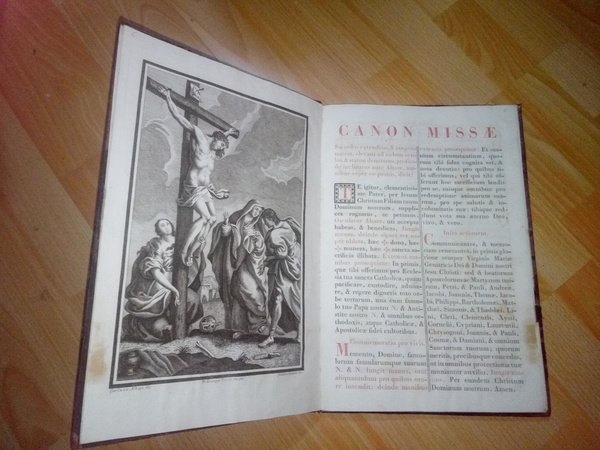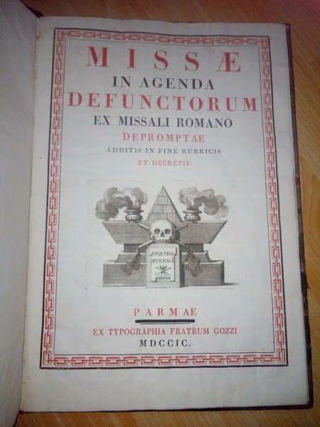 MISSAE IN AGENDA DEFUNCTORUM EX MISSALI ROMANO DEROMPTAE ADDITIS IN FINE RUBRICIS ET DECRETIS.Parmae, Fratrum Gozzi 1799.[Fig. Morte] (cm. 36,5)Piena pelle originale piatti decorati in oro con doppia cornice a rotella, quattro roselline e al centro iniziali C. B. sempre in oro.-pp.32.testo e musica in rosso e nero, compreso frontis entro bordura xilografata con incisione in rame al centro.Grande incisione in rame con crocifissione a p.6 disegnata da G. Albasi e incisa da G. Silvestri.Opera non comune dato l'uso pratico cui era destinata. Abrasioni alla legatura dorso ottimamente restaurato all'interno bell'esemplare.[f15]