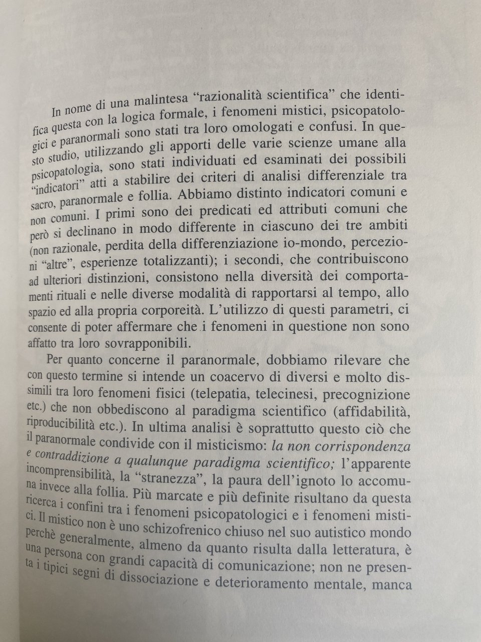Analoghe confusioni ed improprie sovrapposizioni vengono effettuate anche a proposito di magia e sacralità che vengono il più delle volte senza discrimine annoverati tra i fenomeni c.d. soprannaturali. L'omologazione del misticismo e del paranormale alla follia è dovuta in parte anche alla carenza di criteri di analisi differenziale tra questi fenomeni, a pregiudizi storicamente determinati e lungamente sedimentati verso ogni forma di diversità, alla paura che sempre hanno ingenerato l'incomprensibile e l'ignoto. In questo lavoro, utilizzando gli apporti delle varie scienze umane alla psicologia, abbiamo individuato ed esaminato dei possibili indicatori atti a stabilire dei criteri di analisi differenziale tra sacro, paranormale e follia.