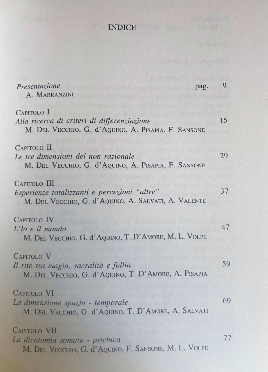 Soggetti: Parapsicologia Saggi Studi Fenomeni mistici paranormali psicopatologici Follia Psicologia Disturbi psichici Psichiatria Mente Pazzia Mistica Misticismo simbolismo Riti collettivi Inconscio Rituali Culti Religione Credenze Fede Religioni Sacro Profano Paranormale Razionalità Distinzioni Significato Senso Dicotomia Iconografia Chiave Mago Magia Libertà Necessità Visioni Fantasie Settenali Assunta Spiritualità Francesco D'Assisi Corpo Dylan Dog Guaritori Santoni Telepatia Telepatici Trance Apparizioni Soteriologia Ambivalenza Sacralità Occultismo Psicosi Precognizione Psicocinetica Rito Illusione Delirio Irrazionale Estasi Chiaroveggenza Allucinazioni Glossario Bibliografia Riferimento Libri rari illustrati fuori catalogo Collezionismo Disegni Comportamento Personalità Scienze umane Chiesa Teologia Gabriele De Rosa Santi Miracoli Ryden Freud Lacan SCA Sostanze stupefacenti Droghe Bateson Percezioni Differenziali Mentali Somenzi Cavanna Allucinazione Analisi differenziale Aspetti scientifici Bartocci Boringhieri Callieri Coscienza Crisi Criteri Definizione Immagine Io Differenza Io-mondo Dimensione DSM Mircea Eliade Esistenziale Esperienza Esperienze totalizzanti Fantasia musicale Fenomenologia Fromm Galimberti Hermann Hesse Illustrazione Ipnosi Lettera ai corinti Logica Manifestazioni Matte Blanco Medicina popolare Mondo magico Organi Pankow Paura Pensiero Perdita Platone Psicoanalisi Psicotico Realtà Rechtschaffen Russel San Gerardo Maiella Schizofrenia Sensoriale Soprannaturale States of consciousness van der Leeuw Volpe Spirito Poteri Fumetti Sartre Simmel Watzlawick Huxley Hegel Jaspers Imbesi Mc Luhan Rjden Ravasi Dittrich Dempsey Ernesto De Martino Eisenberg Carroll Fiabe Favole Immaginario Male Bene Astrologia Dacquino Rey-Mermet Simoes Pelicier Parapsychology Essays Studies Mystical paranormal psychopathological phenomena Madness Psychology Mental disorders Psychiatry Mind Mysticism symbolism Collective rites Unconscious Rituals Cults Religion Beliefs Faith Religions Sacred Profane Rationality Distinctions Meaning Sense Dichotomy Iconography Key Magician Magic Freedom Necessity Visions Fantasies Septenals Assumption Spirituality Francis of Assisi Body Healers Holy Men Telepathy Telepathic Apparitions Soteriology Ambivalence Sacredness Occultism Psychosis Precognition Psychokinetics Rite Illusion Delirium Irrational Ecstasy Clairvoyance Hallucinations Glossary Bibliography Reference Rare illustrated books out of print Collecting Drawings Behavior Personality Human sciences Church Theology Miracles Narcotics Drugs Differential Perceptions Hallucination Analysis Scientific aspects Crisis Criteria Definition Image Self Difference Self-world Existential Dimension Experience Totalizing experiences Musical fantasy Phenomenology Illustration Hypnosis Letter to the Corinthians Manifestations Popular medicine Magical world Organs Fear Thought Loss Plato Psychoanalysis Psychotic Reality Schizophrenia Sensory Supernatural Spirit Powers Comics Fairy tales Fables Imaginary Evil Good Astrology