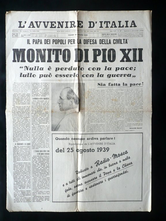 Locandina da edicola, Locandina da edicola - facsimile che contiene l'articolo Il Papa dei Popoli per la difesa della civiltà Monito di Pio XII Nulla è perduto con la pace; tutto può esserlo con la guerra" in "L'Avvenire d'Italia" Anno XLIV - N. 197 Bologna, 25 Agosto 1939 S. d. (ma 1948); locandina da edicola - facsimile della prima pagina del quotidiano "L'Avvenire d'Italia", numero 197 del giorno 25 agosto 1939. Cm 59,5x43. Condizioni di conservazione Esemplare in buone condizioni con tracce d'uso, normali pieghe di conservazione, alcune piccole lievi bruniture; margini e pieghe di conservazione con pochi minimi strappetti. Locandina da edicola - facsimile della prima pagina de "L'Avvenire d'Italia", che contiene il discorso pacifista di Papa Pio XII pronunciato pochi giorni prima dello scoppio del secondo conflitto mondiale. SC03.D10657 N "