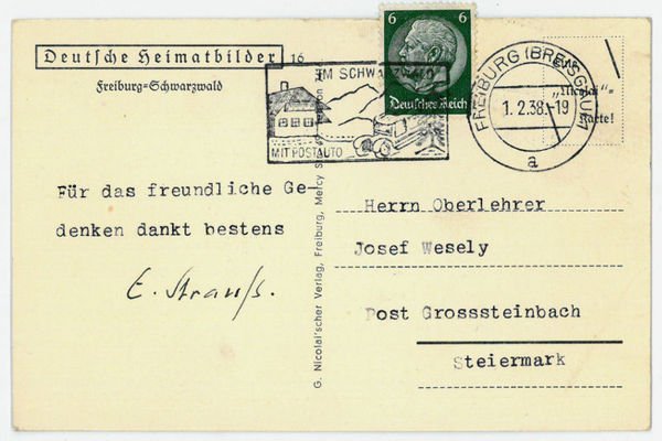 1 S. Qu.-8vo. Dankt Josef Wesely für ihm übersandte Wünsche zum Geburtstag. - Mitglied des Friedrichshagener Dichterkreises, dem u. a. auch Max Halbe, Richard Dehmel und Gerhart Hauptmann angehörten, beschäftigte sich Strauß mit landwirtschaftlich-lebensreformerischen Experimenten, ging längere Zeit auf Reisen (u. a. nach Brasilien, wo er ein Internat leitete) und lebte seit 1894, mit Unterbrechung durch einen vierjährigen Aufenthalt in der Dresdner Künstlerkolonie Hellerau, in Süddeutschland. Mitglied der Sektion für Dichtkunst der Preußischen Akademie der Künste und seit 1930 Mitglied der NSDAP, sind seine Werke von einer neuromantischen Harmonisierung des Volkslebens und von Traditionsbewußtsein bestimmt; gelegentlich auch völkische Tendenzen aufweisend, erreichten sie während des Dritten Reichs hohe Auflagen. Vgl. Kosch XX, 569ff. - Die Bildseite der Karte mit der Ansicht eines Posaunenengels am Turm von Münster.
