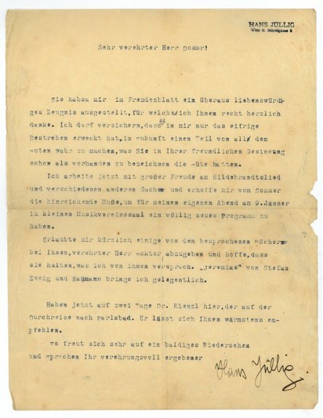 1 S. Gr.-4to. An einen namentlich nicht genannten Adressaten mit Dank für ein "überaus liebenswürdiges Zeugnis", das dieser ihm im "Fremdenblatt" ausgestellt habe: "[.] Ich arbeite jetzt mit großer Freude am Hildebrandtslied und verschiedenen anderen Sachen und erhoffe mir vom Sommer die hinreichende Muße, um für meinen eigenen Abend am 9. Jänner im kleinen Musikvereinssaal ein völlig neues Programm zu haben [.]". - Hans Jüllig war als Geiger im In- und Ausland tätig und unterrichtete als Lehrer am Arbeiterkonservatorium sowie an Bundeserziehungs- und Lehrerbildungsanstalten. Neben Lyrik, Epen, Dramen und Romane verfaßte er auch Hörspiele und Hörbilder für den Österreichischen Schulfunk (überwiegend musikgeschichtlichen Inhalts). - Mit kleinen Randläsuren und etwas gebräunt.