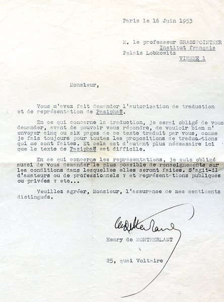 1 S. 4to. An den Lyriker und Essayisten Walter Grasspointer (1899-1963): "Vous m'avez fait demander l'autorisation de traduction et de représentation de Pasiphaë. En ce qui concerne la traduction, je serai obligé de vous demander, avant de pouvoir vous répondre, de vouloir bien m'envoyer cinq ou six pages de ce texte traduit par vous, comme ja fais toujours pour toutes les propositions de traductions qui me sont faites. Et cela est d'autant plus nécessaires ici que le texte de Pasiphaë est difficile [.]". - Stärker knittrig sowie mit einigen Randeinrissen.