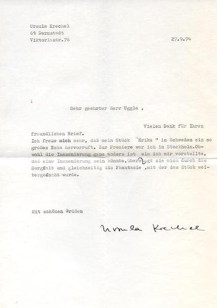 ¾ S. Gr.-4to. Mit ms. adr. Kuvert. An einen Sammler: "[.] Ich freue mich sehr, daß mein Stück 'Erika' in Schweden ein so großes Echo hervorruft. Zur Premiere war ich in Stockholm. Obwohl die Inszenierung ganz anders ist als ich mir vorstellte, daß eine Inszenierung sein könnte, überzeugt sie mich durch die Sorgfalt und gleichzeitig die Phantasie, mit der das Stück weitergedacht wurde [.]".