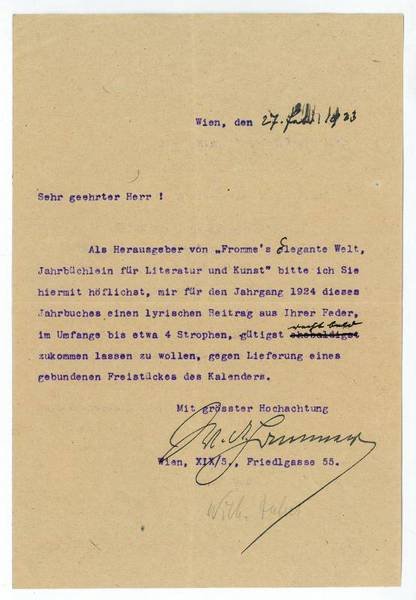 1 S. auf Doppelblatt. 4to. An einen namentlich nicht genannten Adressaten: "Als Herausgeber von 'Fromme's Elegante Welt, Jahrbüchlein für Literatur und Kunst' bitte ich Sie hiermit höflichst, mir für den Jahrgang 1924 dieses Jahrbuches einen lyrischen Beitrag aus Ihrer Feder, im Umfange bis etwa 4 Strophen gütigst recht bald zukommen lassen zu wollen, gegen Lieferung eines gebundenen Freistückes des Kalenders […]". - Hammer redigierte 1893/94 die "Blätter für deutsche Dichtung" und als Schriftleiter des Scheffel-Bundes eine Reihe von "Scheffel-Jahrbüchern" und "Scheffel-Kalendern". Daneben war er als Lyriker, Epiker, Herausgeber und Übersetzer tätig. Vgl. Kosch I, 818.