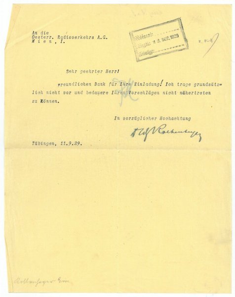 ½ S. 4to. An die Österr. Radioverkehrs A.G.: "Freundlichen Dank für Ihre Einladung! Ich trage grundsätzlich nicht vor und bedaure Ihren Vorschlägen nicht nähertreten zu können".