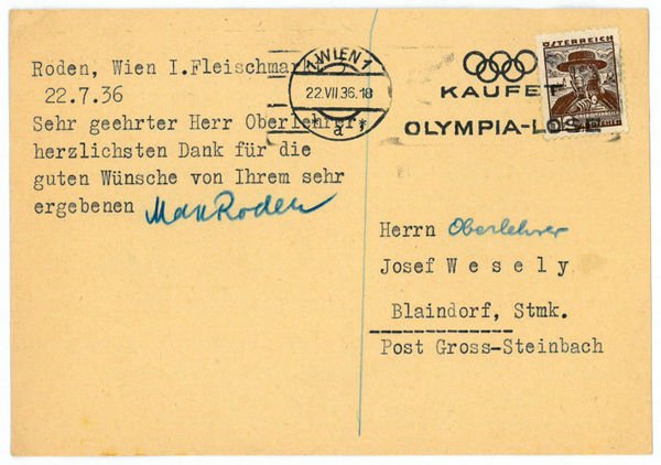 1 S. Qu.-8vo. Dankt Josef Wesely für ihm übersandte Wünsche zum Geburtstag. - Der vornehmlich als Lyriker tätige Max Roden war von 1906 bis 1938 Herausgeber und Kunstkritiker der "Österreichischen Volkszeitung"; nach seiner Emigration über Shanghai nach New York (1940), wo er bis zu seinem Tode lebte, arbeitete Roden u. a. für die "New Yorker Staats-Zeitung" und den "Herold". Vgl. Kosch XIII, 127f.