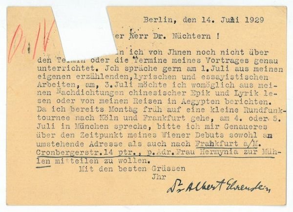 1 S. Qu.-8vo. Mit ms. Adresse. An den Journalisten und Dramaturgen Hans Nüchtern, seit 1924 Leiter der literarischen Abteilung der RAVAG, über seine beiden Wiener Vorträge: "[.] Ich spräche gern am 1. Juli aus meinen eigenen erzählenden, lyrischen und essayistischen Arbeiten, am 3. Juli möchte ich womöglich aus meinen Nachdichtungen chinesischer Epik und Lyrik lesen oder von meinen Reisen in Aegypten berichten [.]". - Die Briefmarke ausgeschnitten (geringf. Textverlust).
