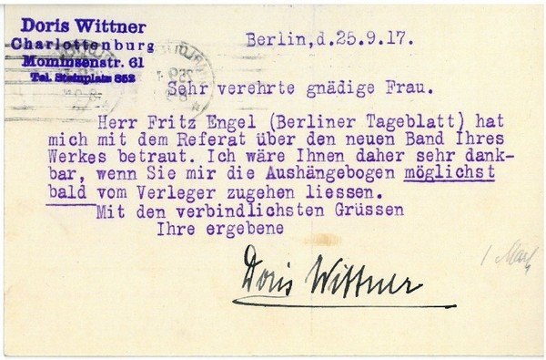 2 SS. Qu.-8vo. An die Feministin und Sexualreformerin Grete Meisel-Hess (1879-1922): "Herr Fritz Engel (Berliner Tageblatt) hat mich mit derm Referat über den neuen Band Ihres Werkes betraut. Ich wäre Ihnen daher sehr dankbar, wenn Sie mir die Aushängebogen möglichst bald vom Verleger zugehen liessen". - Doris Wittner war 1922-25 verantwortliche Redakteurin der Zeitschrift "Der Roland von Berlin", 1931 Mitherausgeberin der "Freien Jüdischen Monatsschau". Neben der journalistischen Tagesarbeit schrieb sie Romane.