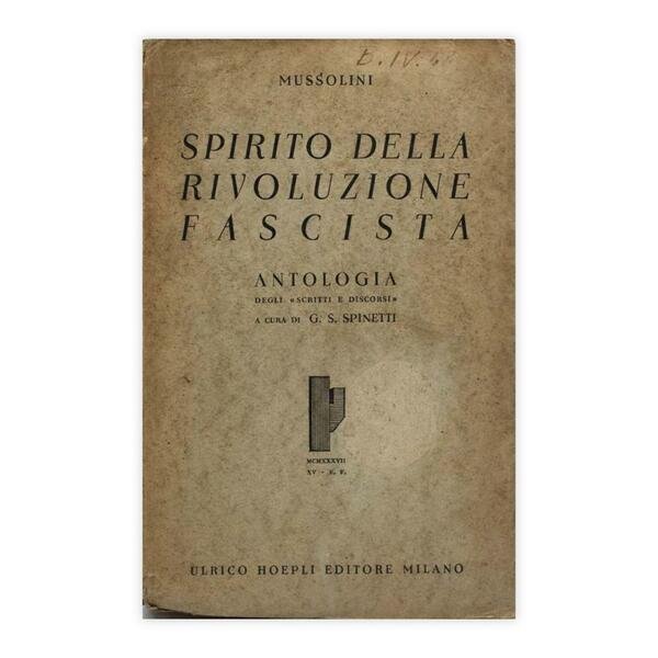 Autore: Mussolini Titolo: Spirito della rivoluzione fascista Sottotitolo: Antologia degli "Scritti e Discorsi" a cura di G. Spinetti - Unica edizione autorizzata Edizione: Urlico Hoepli Editore 1937 Dimensioni: 13 x 19,5 cm c.a. Pagine: 315 Copertina: Brossura con alette Condizioni: Buone come da foto