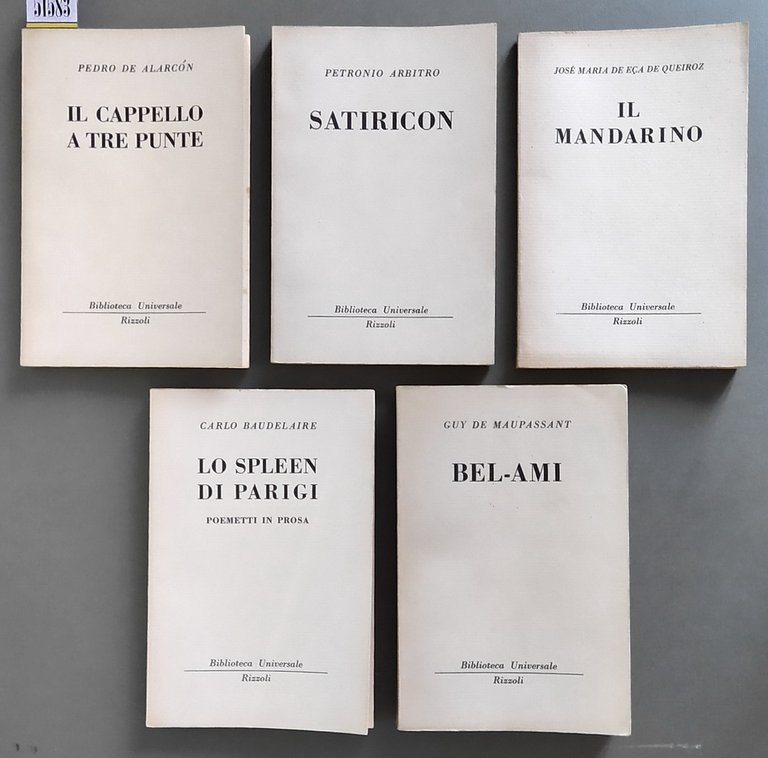 Edizione: descrizione del lotto libri bur: 1) il cappello a tre pute (pedro de alarcon), traduzione di giuseppe bellini, pp. 93, (3), 3. edizione (n. 130 bur) - 2) satiricon (petronio arbitro), traduzione di ugo dettore, pp. 167, (1), 4. edizione (n. 531-532 bur) - 3) il mandarino (jose' m. de eã§a de queiroz), traduzione di laura marchiori, pp. 94, (2), 1. edizione: luglio 1953 (n. 595 bur) - 4) lo spleen di parigi poemetti in prosa (carlo baudelaire), traduzione di piero bianconi, pp. 128, (7), 1. edizione: settembre 1955 (n. 906-907 bur) - 5) bel-ami (guy de maupassant), traduzione di orsola nemi, pp. 307, (5), 1. edizione: novembre 1955 (n. 936-938 bur).