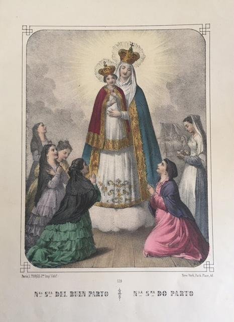 >Litografia originale a colori raffigurante la Madonna del Parto con il bambino in braccio ed alcune donne intente a venerarla. Titolo e note tipografiche lungo il margine inferiore.